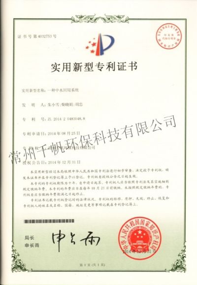 實用新型專利證書 一種平板膜組件震蕩清洗系統(tǒng)